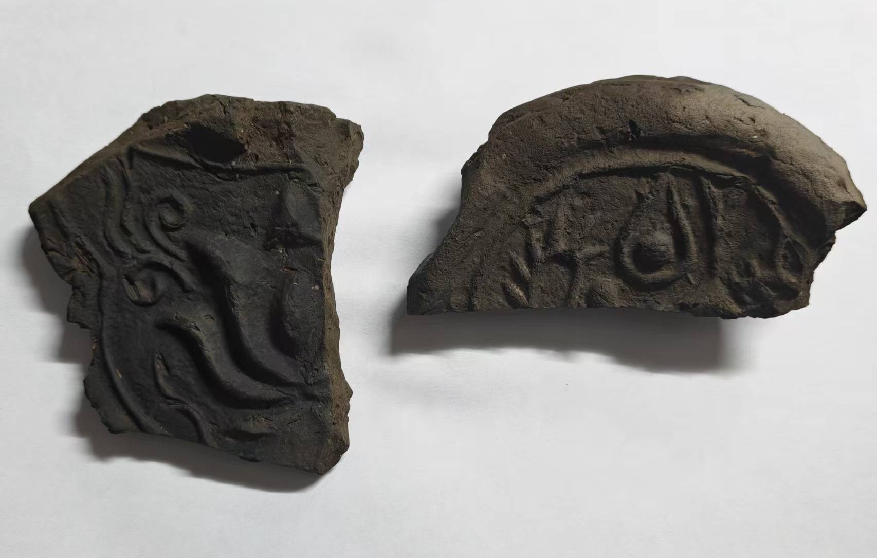 搜索得知瓦当主材质是灰陶、琉璃和金属,立即判断这两个瓦当是灰陶烧制而成的。